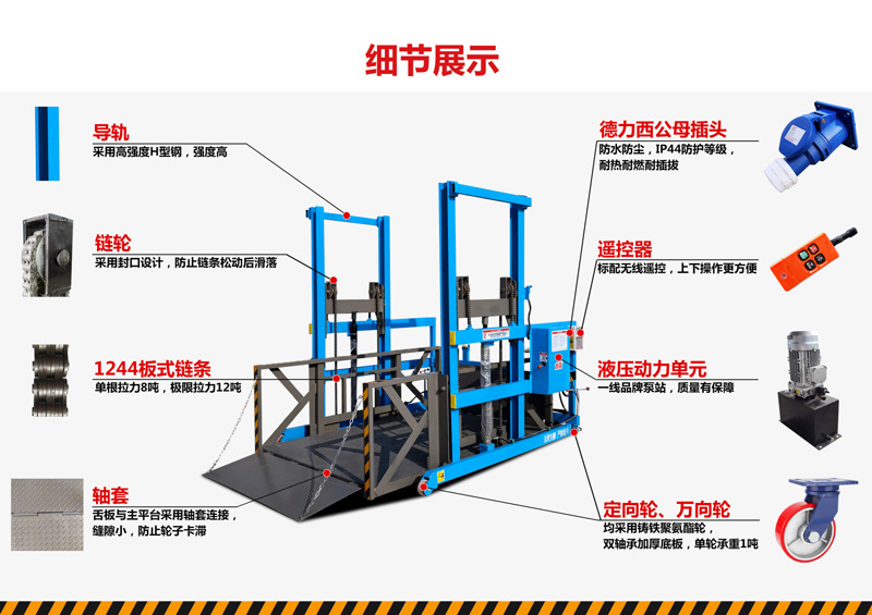 2. 液压系统:泵站、油缸,实现平稳升降,匹配不同车厢高度;部分手动液压款无需接电,电动款支持遥控;